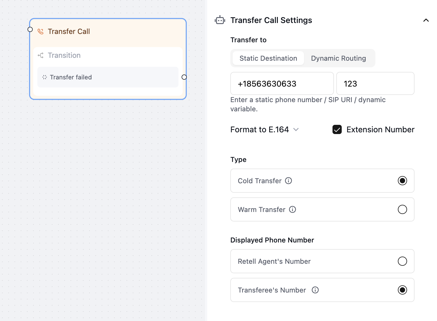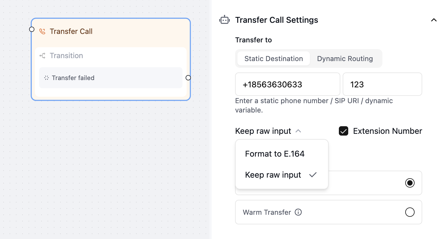- (Optional) if your transfer destination is not in e.164 format then you can choose to keep the input as is by choosing raw format. This only applies when you are using custom telephony and does not apply when you are using Retell Telephony. This can be useful when you want to transfer to internal pseudo numbers. This can be useful when you want to transfer to internal pseudo numbers.