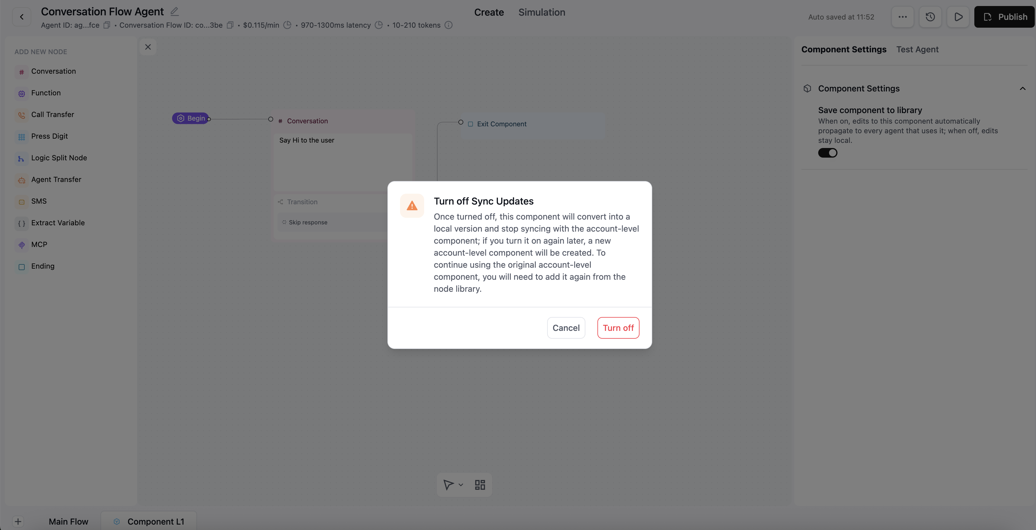 - Deleting a shared Component from the library downgrades linked instances in agents to local copies and stops sync updates (your agents keep working).