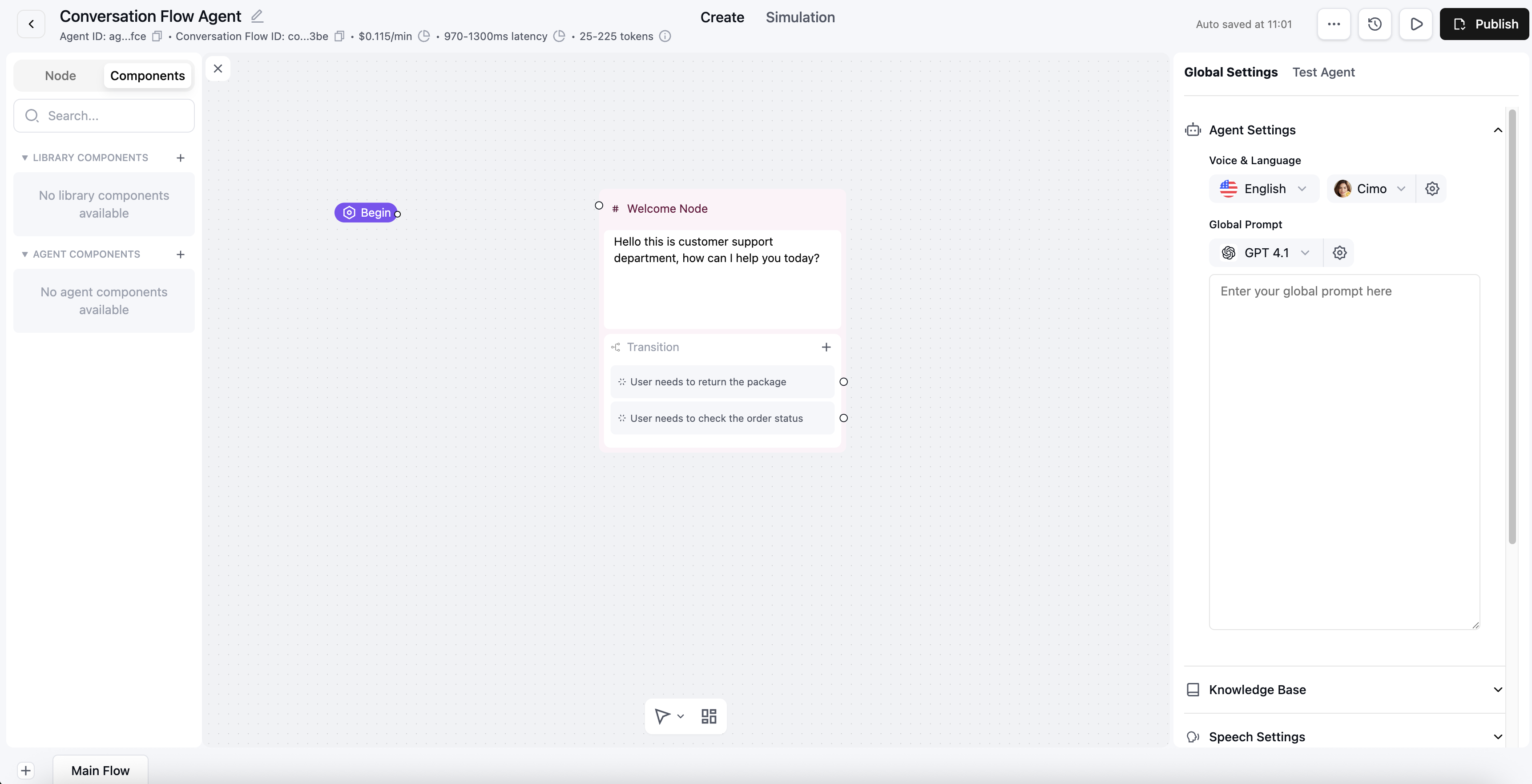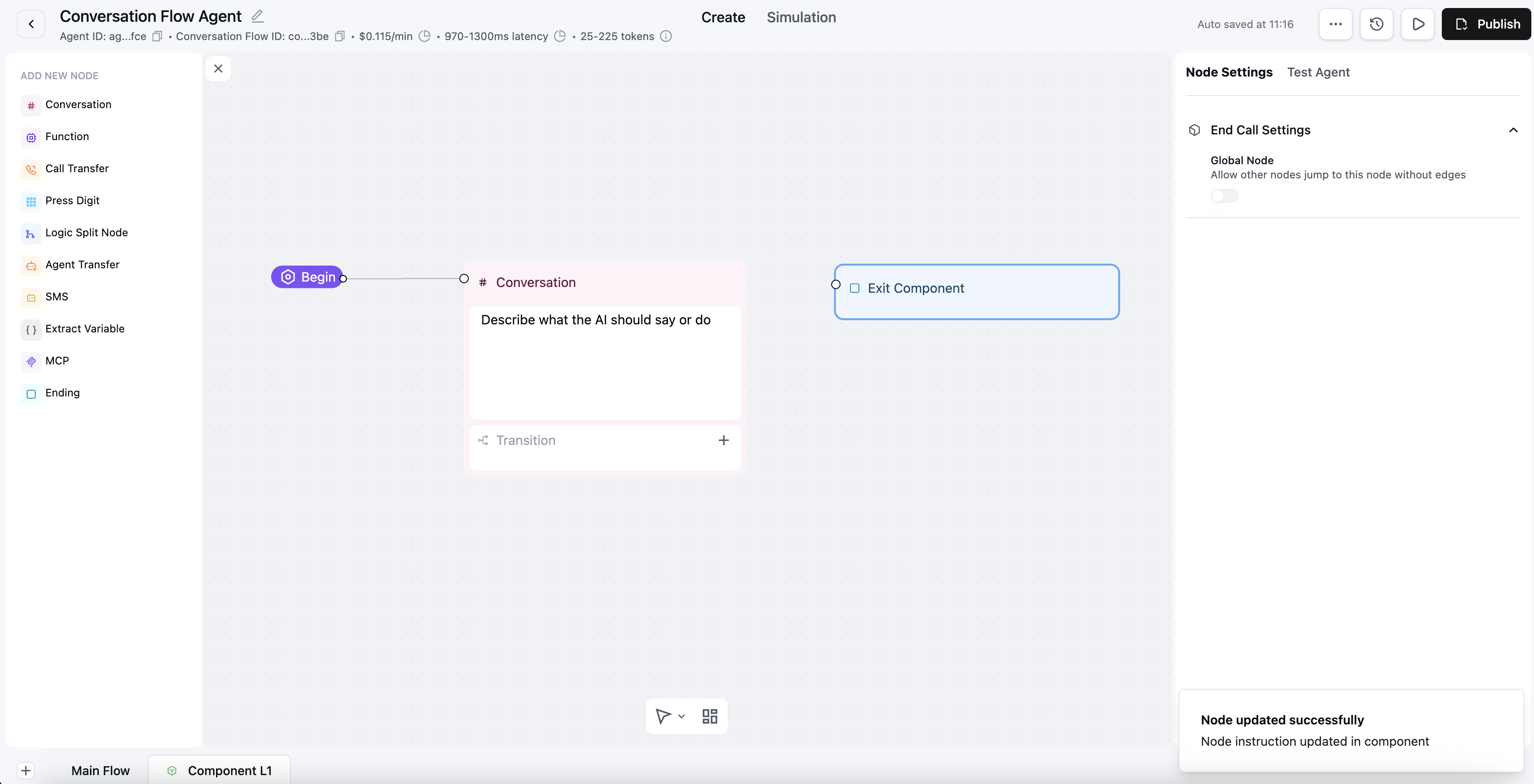 - You’ll start with a “Begin” node, a basic conversation node and an “Exit Component” end node.