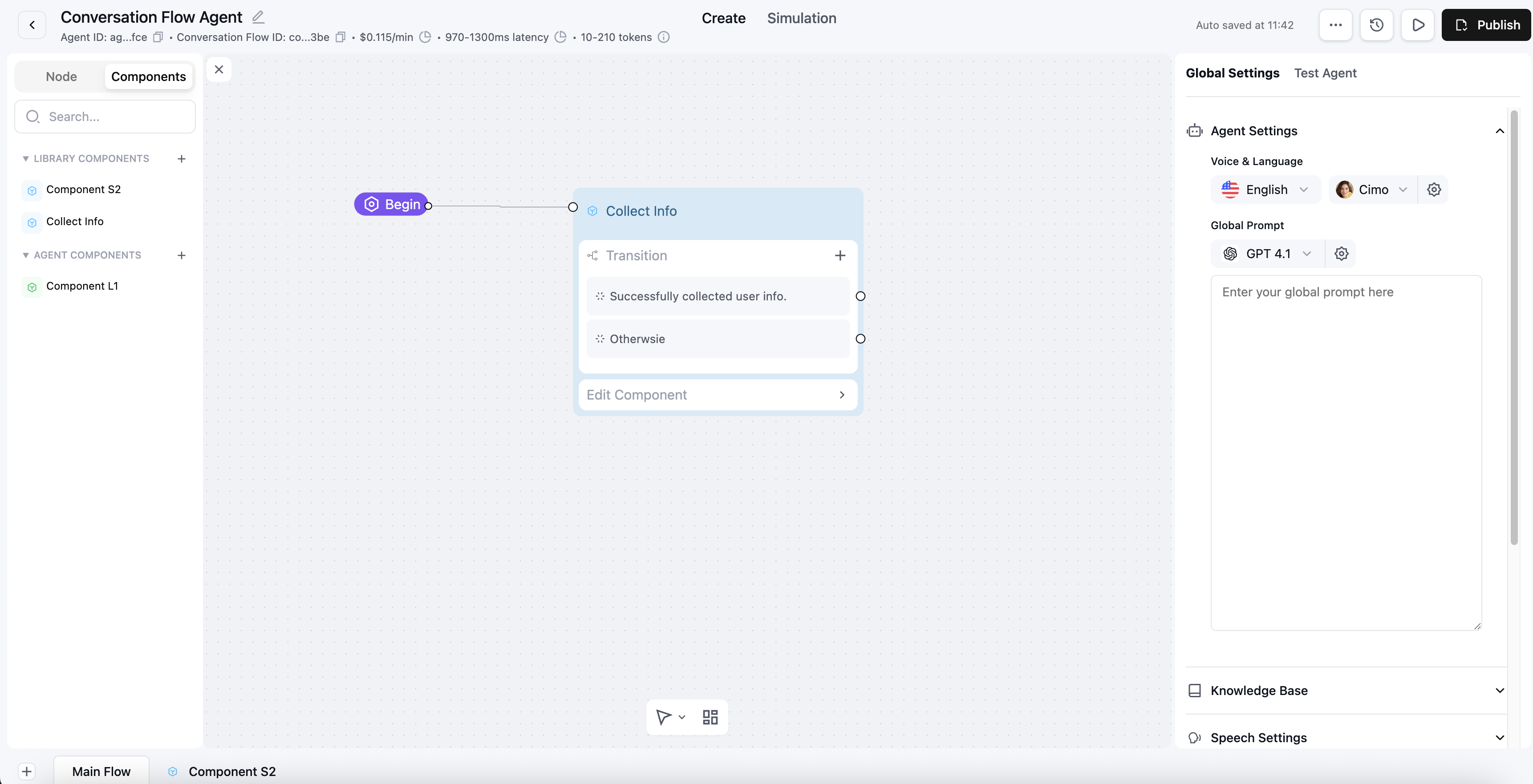 You can create either a library (shared) Component or an agent-level (local) one. Both open in a dedicated editor tab.- Create a Component: