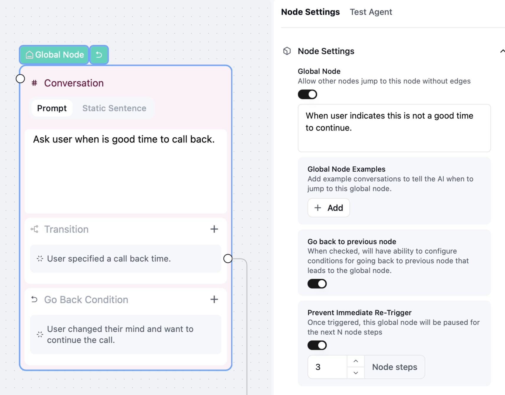 Set a condition for when the global node should be transitioned to. In the example above, the condition isWhen user indicates this is not a good time to continue — so whenever the user says something like I need to call back later, the agent transitions to this node.