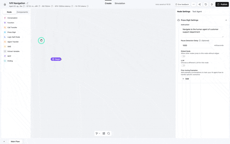 Transitions occur when the IVR system finishes speaking. When writing your transitions, ensure you cover both successful navigation and potential failure scenarios or edge cases.Success scenario: Define when the agent has successfully navigated to the target. For example, write conditions like