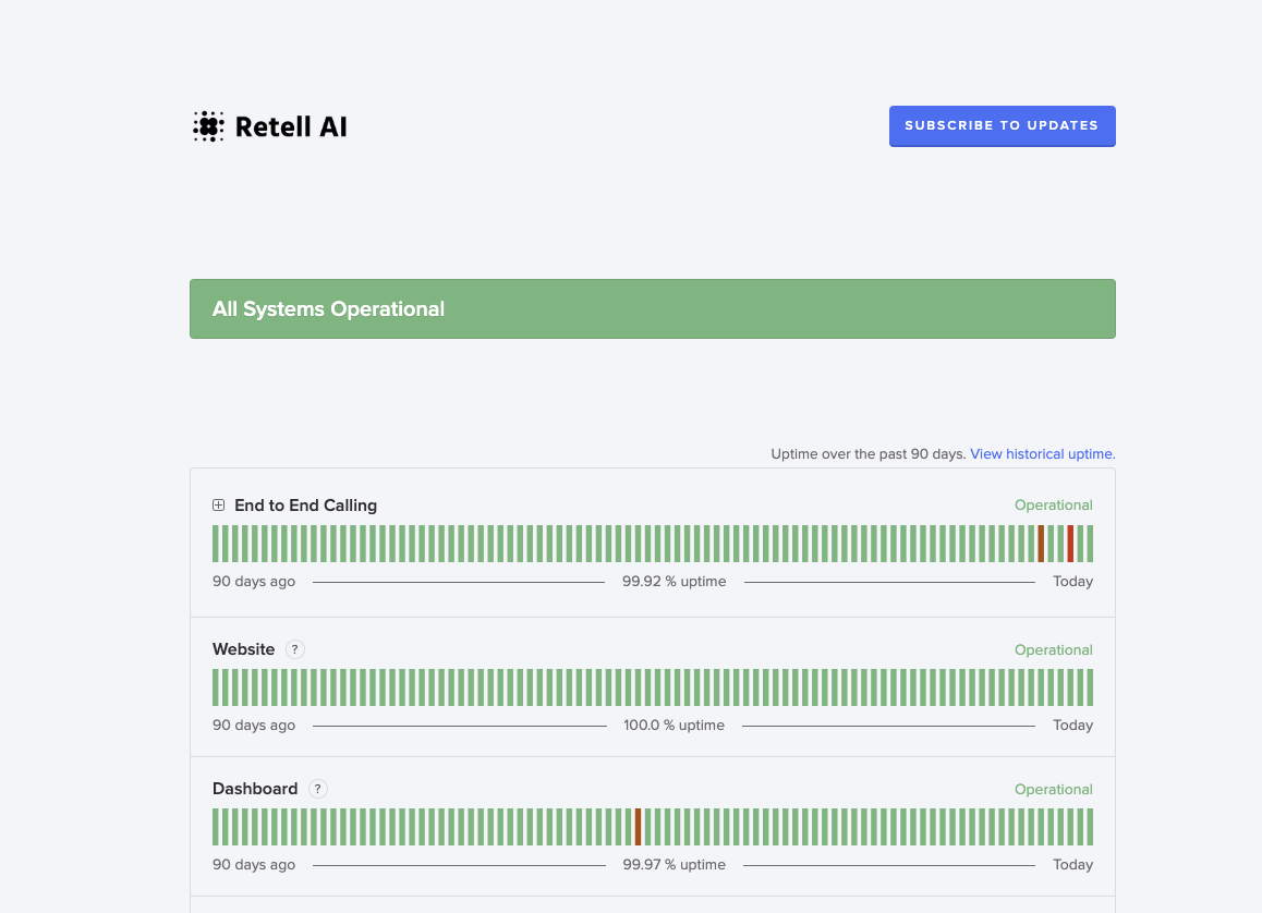 At Retell, we guarantee >99.9% uptime. To achieve this, we’ve invested on the following areas:- Enterprise-grade infrastructure