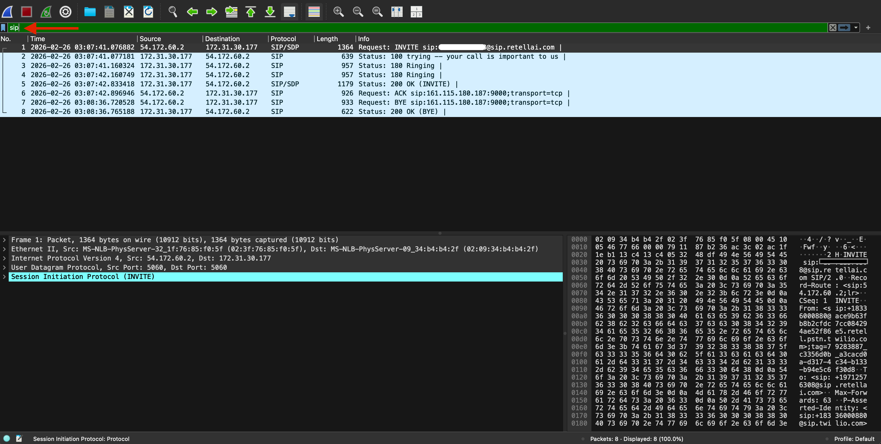 If you are using Retell with a custom SIP trunk, capture traffic on the server or gateway that terminates SIP — not your local machine. See Custom Telephony for Retell’s SIP server IP ranges to filter for.