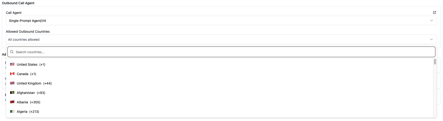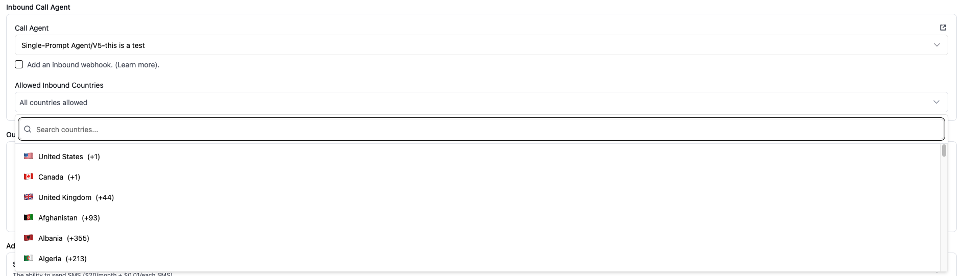 You can restrict which countries are allowed to make inbound calls to your Retell phone numbers, and which countries your phone numbers can make outbound calls to. This helps prevent International Revenue Sharing Fraud (IRSF) and limits your exposure to unwanted traffic.Allowed Inbound Countries