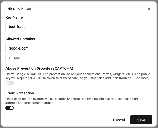 You can enable fraud protection when creating or updating a public key:- Navigate to Public Keys in your Retell dashboard